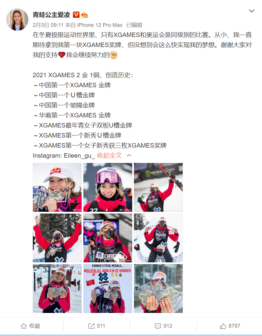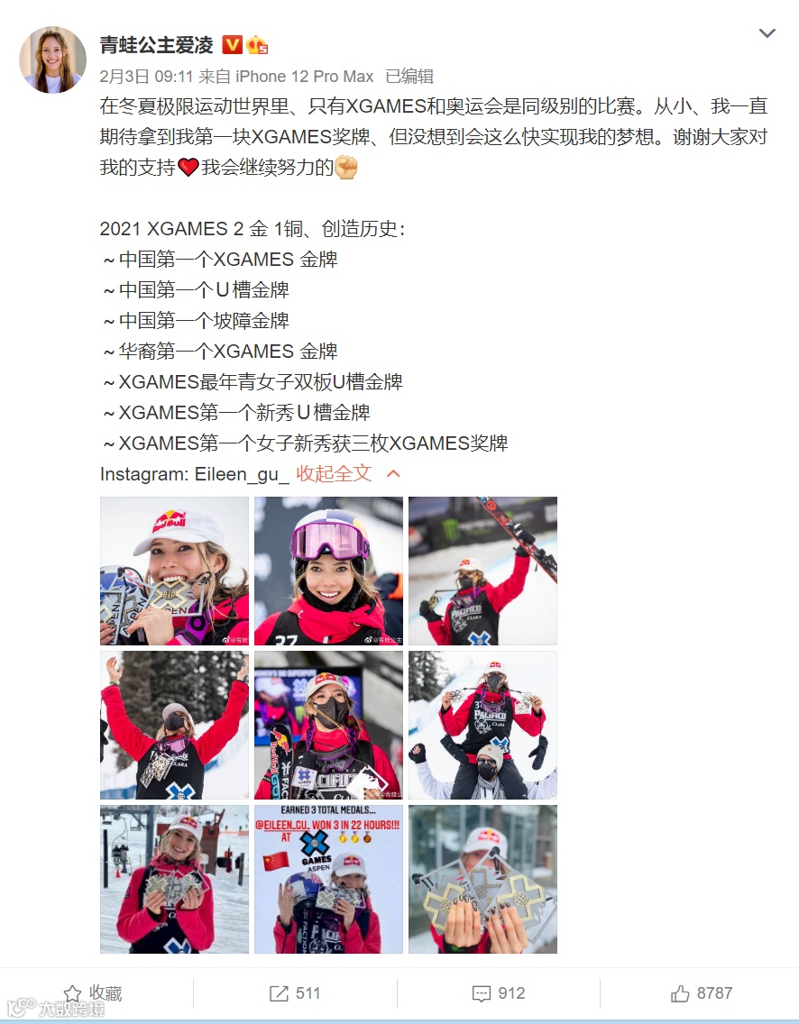 2021年1月底,在冬季世界极限运动会 (X-GAME) 中,首次受邀参赛的谷爱凌在两天之内拿下了两金一铜,还创下了一连串的“第一人”纪录:第一位在世界极限运动会夺金的中国运动员、第一位首次参加极限运动会自由式滑雪U型场地比赛便夺金的选手、第一位首次参加冬季极限运动会便带走两枚金牌的新秀女将。