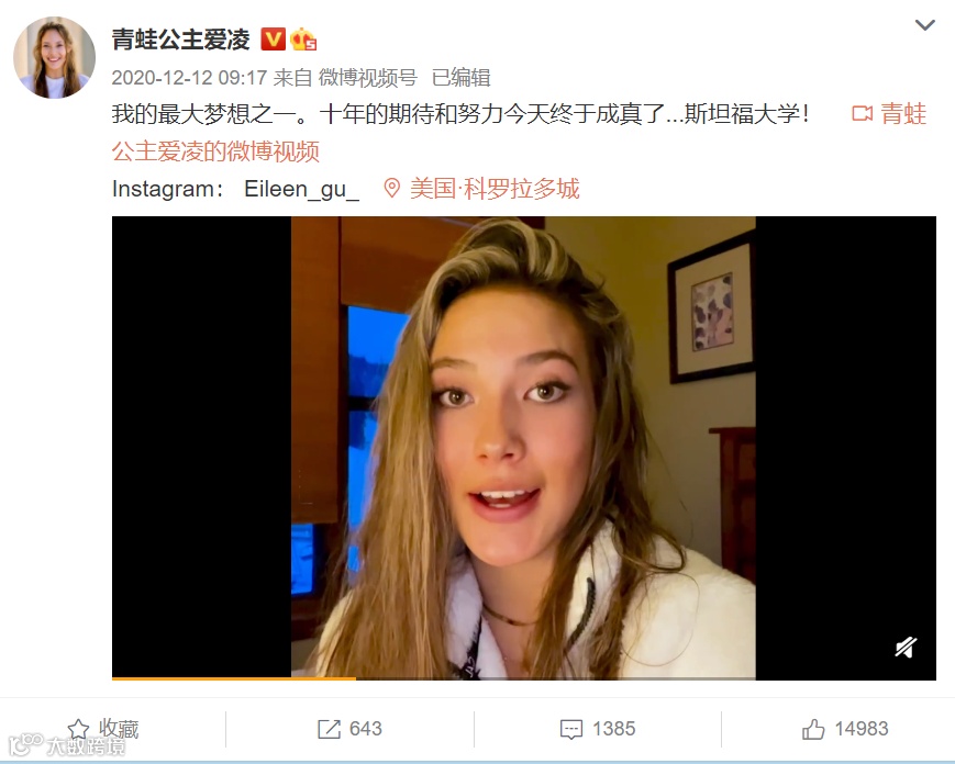 2020年12月,谷爱凌宣布,自己被美国名校斯坦福大学录取。