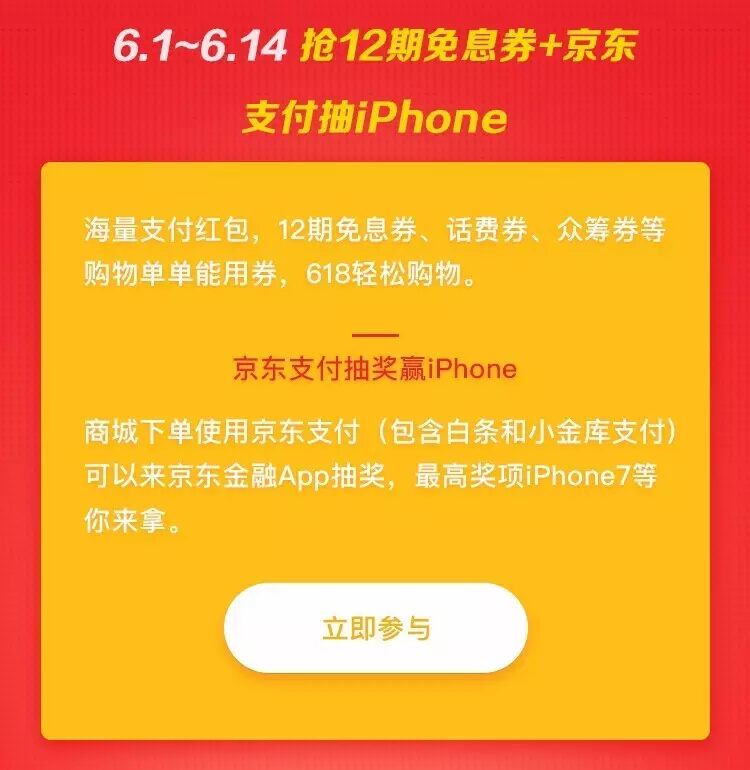 导读:抢12期免息券、话费券、众筹券、单单能用券,使用白条支付和小金库支付可参加抽奖赢iPhone!