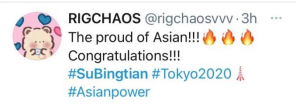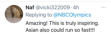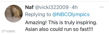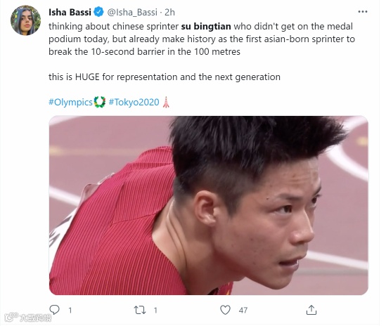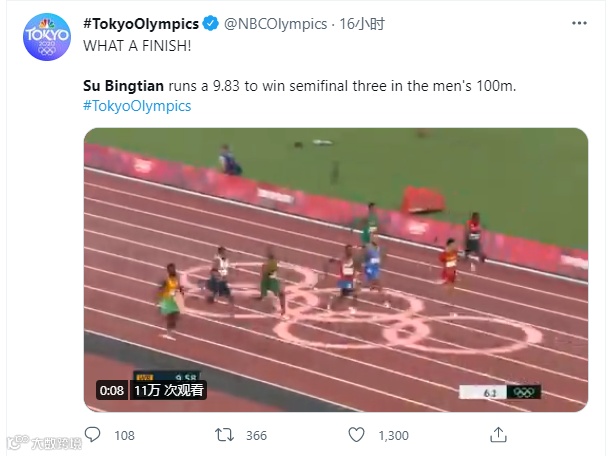 在苏炳添半决赛以9秒83的成绩进入决赛后,美国全国广播公司(NBC)的奥运报道账号在推特上感叹:“多棒的成绩!苏炳添跑出9.83秒的成绩赢得男子100米半决赛。”