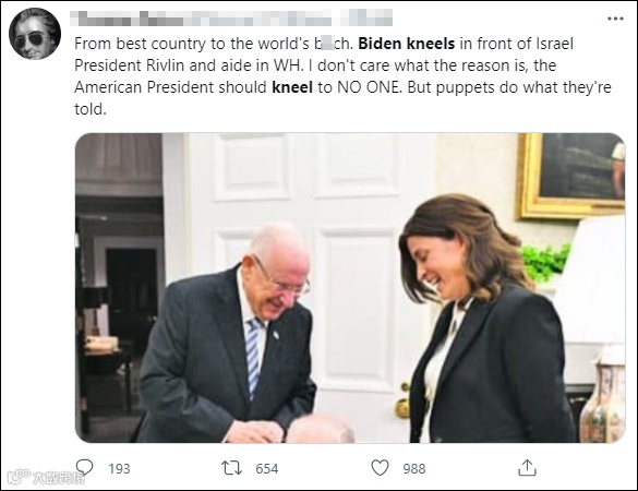 这张拜登的“下跪照”被冠上了“拜登跪在以色列总统面前,承诺无条件支持以色列”的标题。