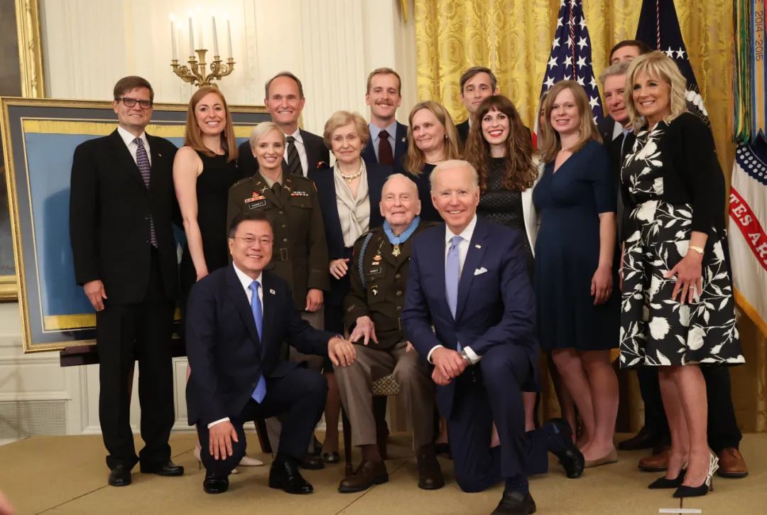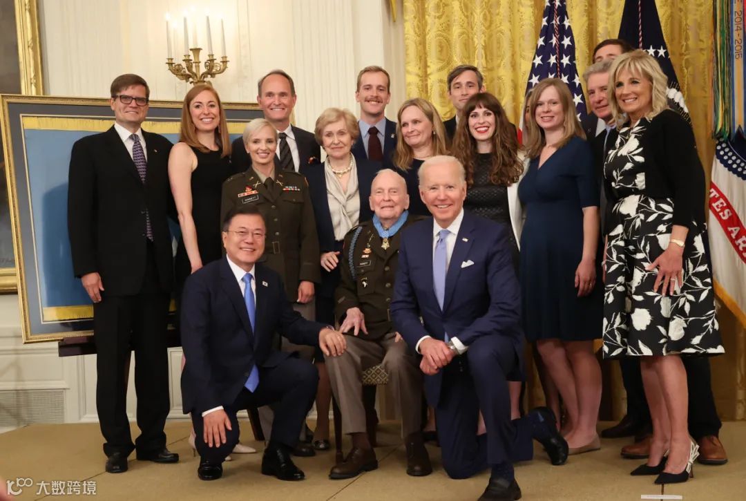 In May this year, Biden and Moon Jae-in met in the White House to present the Medal of Honor to a 94-year-old veteran. In the group photo, Biden kneeled beside the soldier and his family. This unexpected behavior made Moon feel awkward, and he could only kneel down too.