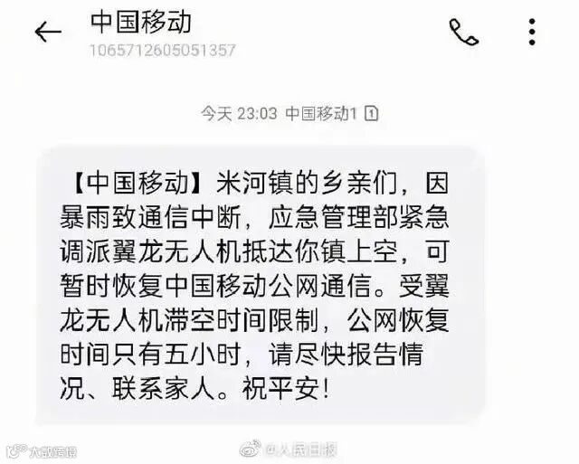 7月21日18点21分,无人机在米河镇上空搭起空中移动基站,实现了约50平方公里范围、长时稳定的连续移动信号覆盖。