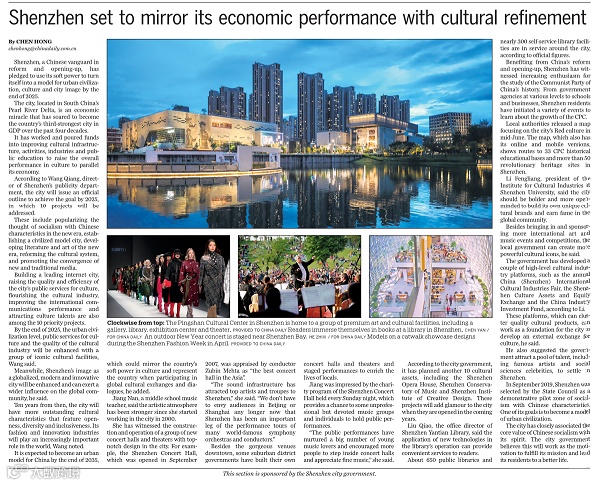 It (Shenzhen) has worked and poured funds into improving cultural infrastructure, activities, industries and public education to raise the overall performance in culture to parallel its economy.