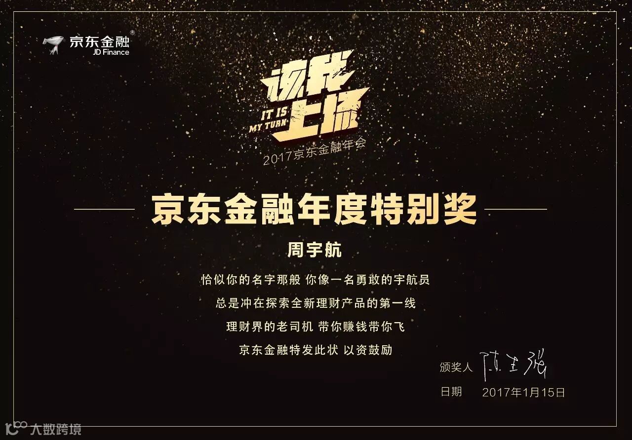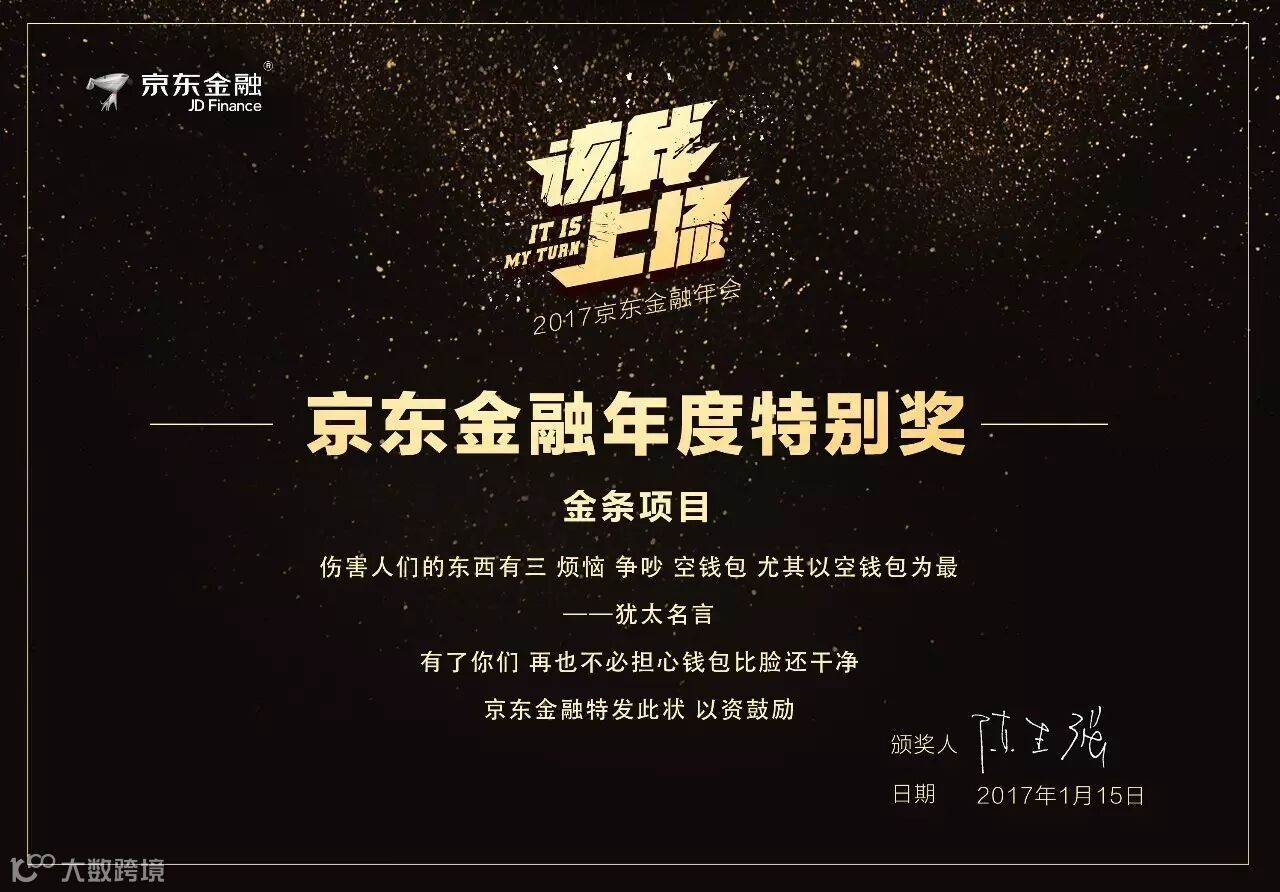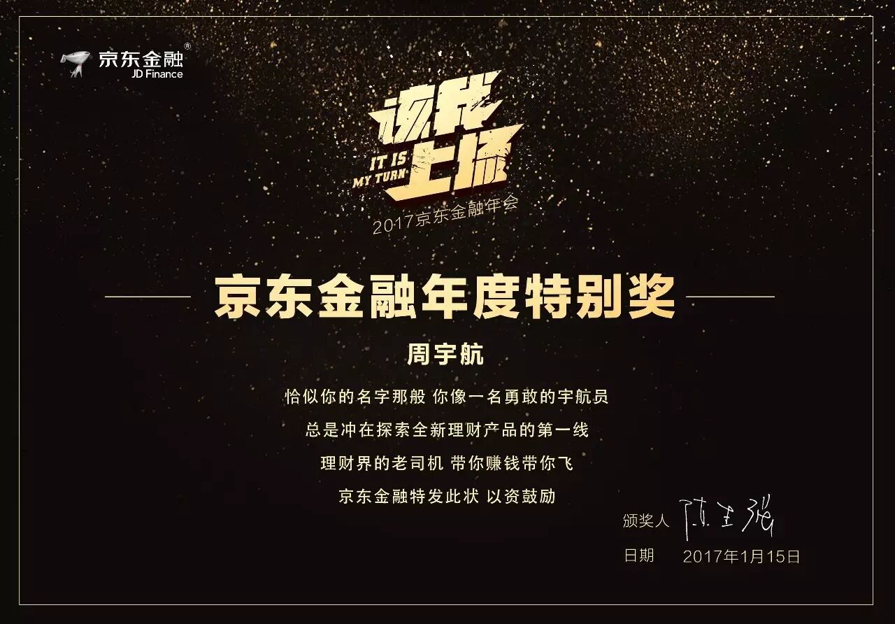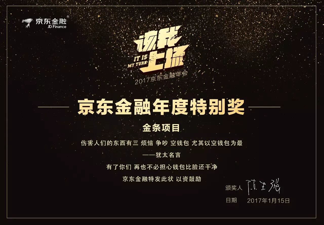 京东金融年度特别奖(团队)由金条项目领走,整个团队抱走了价值一千万的京东金融股票,老陈亲自颁奖哦~~有了他们,mm再也不用担心钱包比脸还干净