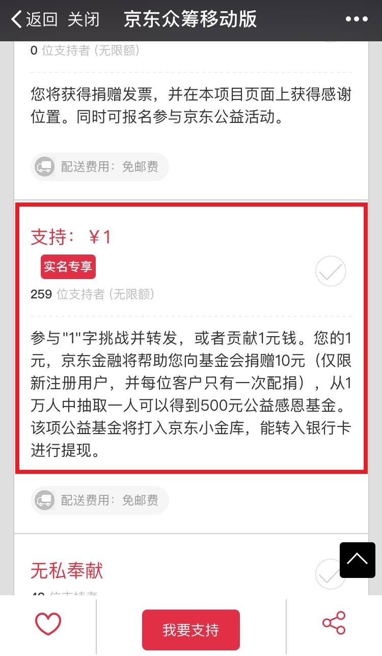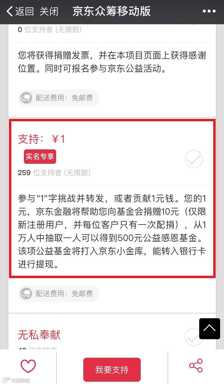 4.不能完成动作,却依然想要参与公益活动的朋友,可以通过点击“阅读原文”进入众筹页面捐助一元钱,你出1元做公益,京东金融帮你出10元