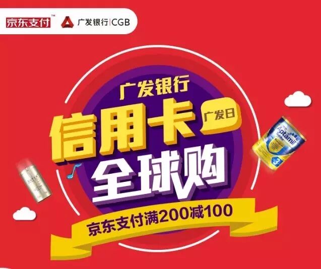 每周五10:00开始,在京东全球购使用京东支付-广发银行信用卡支付,单笔满200元立减100元,每天1500个名额。