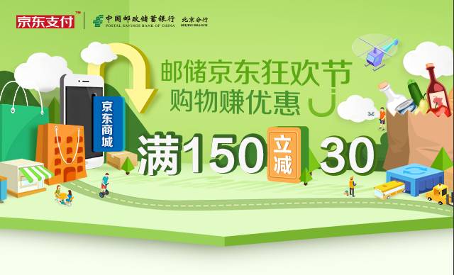 活动期间,在京东商城使用京东支付-邮储银行北京地区借记卡(卡号第7、8位为10)支付,每日可享单笔满50元立减10元、满100减20元、满150减30元的随机满减优惠。