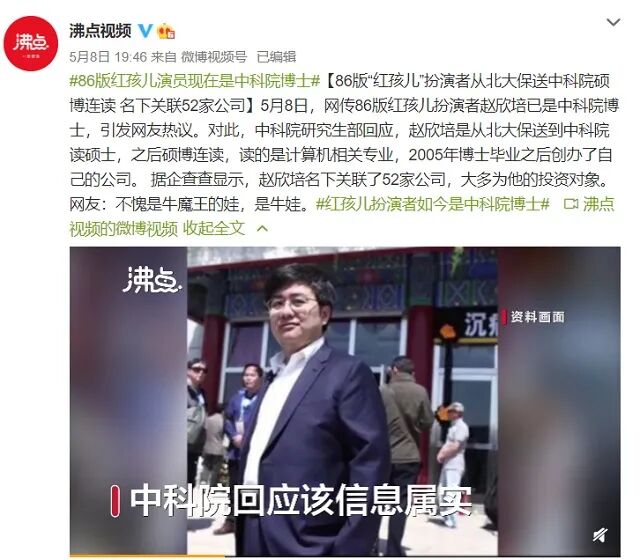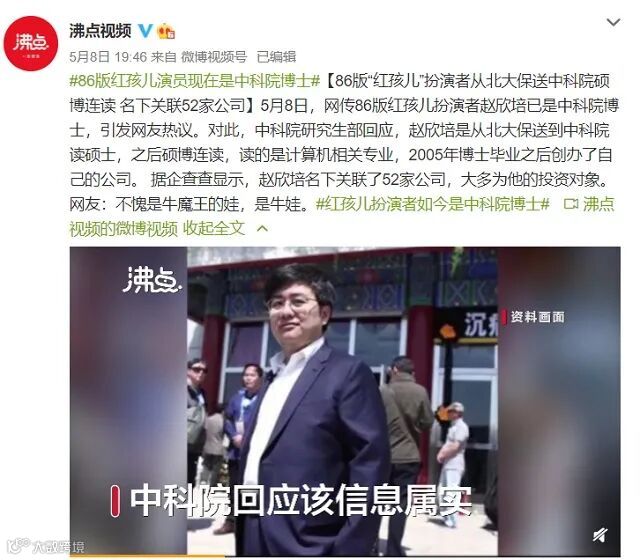 最近,网传红孩儿扮演者赵欣培已是中科院博士。据沸点视频消息,中科院研究生部对此回应,赵欣培是从北大保送到中科院读硕士,之后硕博连读,读的是计算机相关专业,2005年博士毕业之后创业。