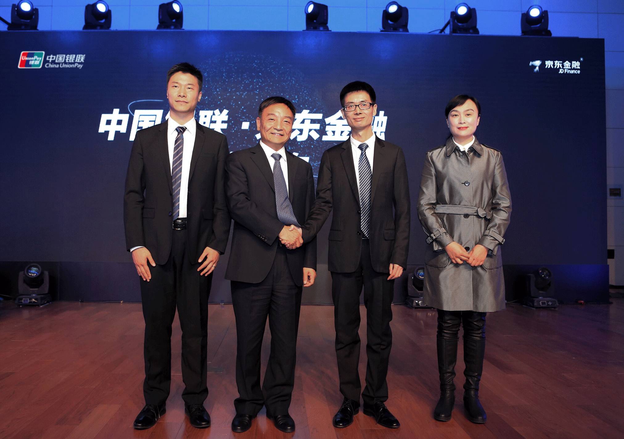 左起:京东金融副总裁许凌、中国银联总裁时文朝、京东金融首席执行官陈生强、中国银联助理总裁胡莹