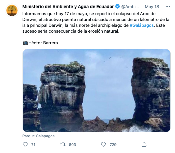 Darwin’s Arch, a rock formation south-east of Darwin Island in the Galápagos archipelago, has collapsed due to natural erosion, Ecuador’s environment ministry said.