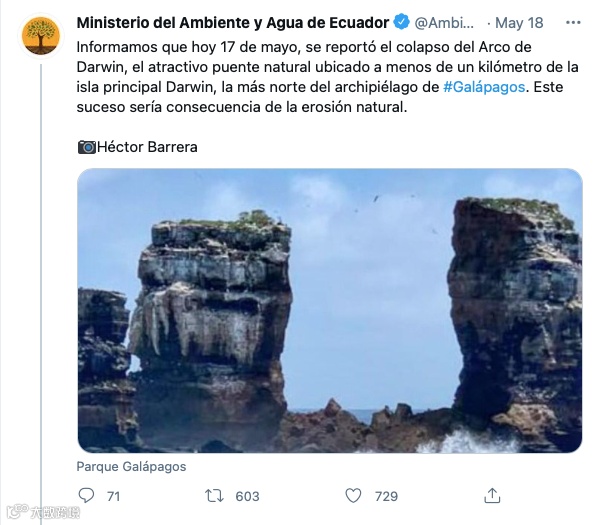 厄瓜多尔环境与水利部18日发表声明,当地时间17日,加拉帕戈斯群岛著名潜水和旅游打卡地“达尔文拱门(Darwin's Arch)”因为自然侵蚀坍塌。