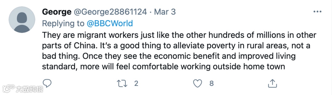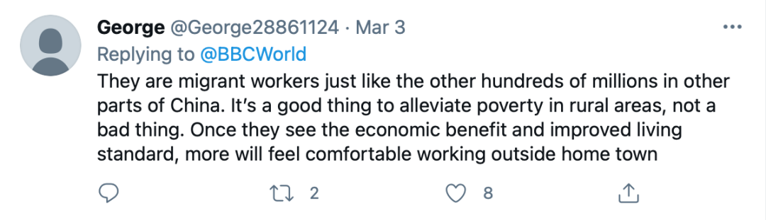 网友George:他们是外出务工人员,和其他成千上万的在中国各个地方外出务工的人一样。对于减贫,(外出务工)是一件好事,而不是坏事。一旦他们看到了经济上的收益以及生活条件上的改善,更多人会愿意离开家乡,外出工作。