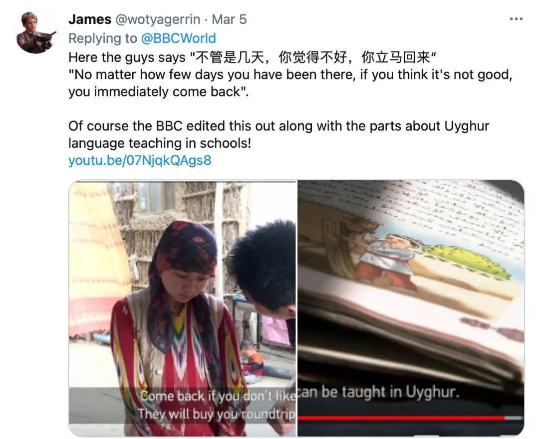 同时,援疆工作人员只是想鼓励布再娜普试试。央视的视频里,工作人员说得很清晰:“(如果)你觉得不好,你立马回来”。但是BBC却恶意剪辑,故意不翻译这部分内容,制造了所谓的“政府工作人员强迫新疆女孩务工”的情景。
