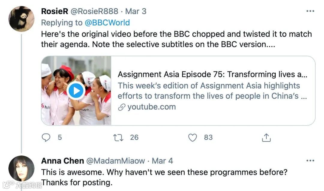 网友RosieR:这是未被BBC为了其政治意图而进行剪辑和歪曲的原视频。注意BBC版视频里选的字幕……