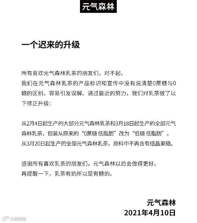 4月10日,国内饮料品牌元气森林发布致歉声明“一个迟来的升级”,声明中称在乳茶产品的产品标示和宣传中,没有说明“0蔗糖”与“0糖”的区别,容易引发误解。