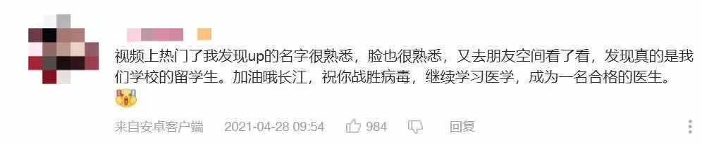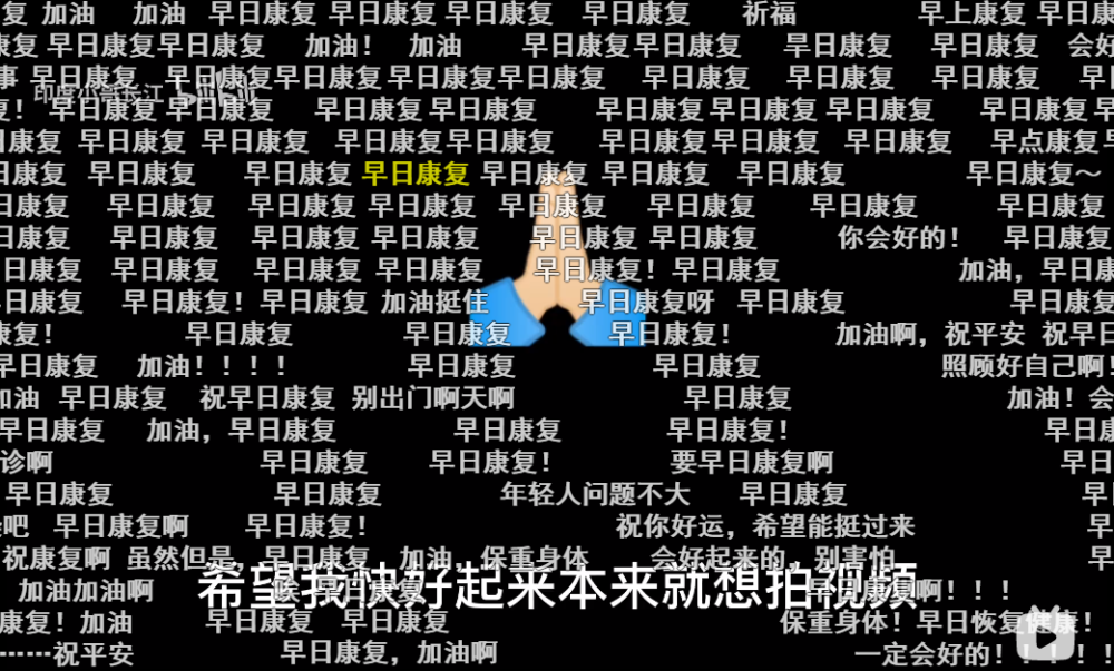 长江的视频被中国网友们的弹幕刷屏,大家纷纷祝福他“早日康复”。
