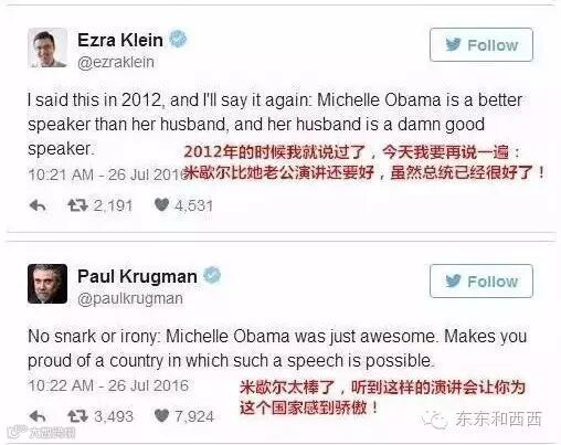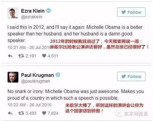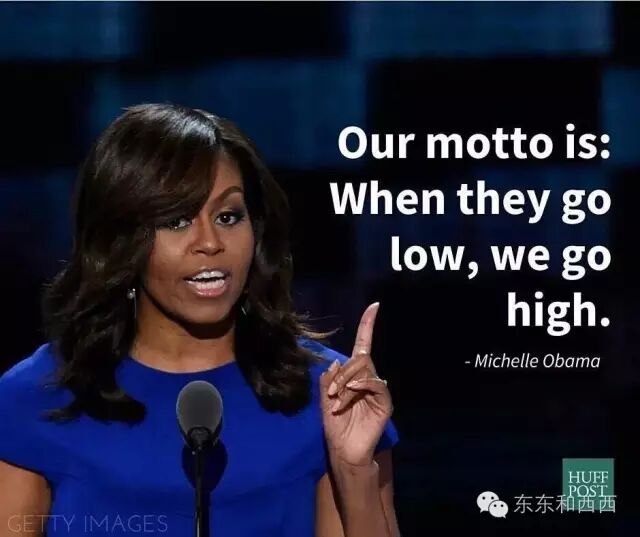 她讲话又真实又有感染力,每次都会被网友疯狂转发。前段时间支持希拉里的演讲,When they go low, we go high(当别人往道德的低处走,我们要继续向高处前行)已经成了金句,既打击了对方,还鼓劲自己人。上次东东和西西放了视频,很多妹子看了觉得她当美国总统都不奇怪。