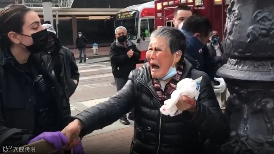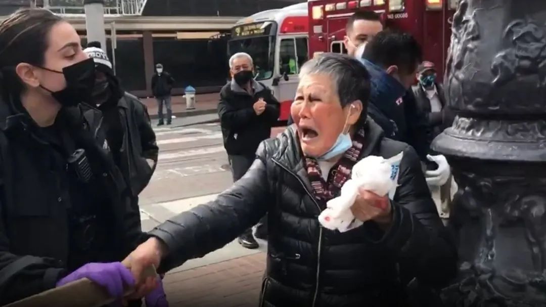 当地时间3月17日美国旧金山市场街,七旬华裔老太遭白人男子袭击后挥棍反击