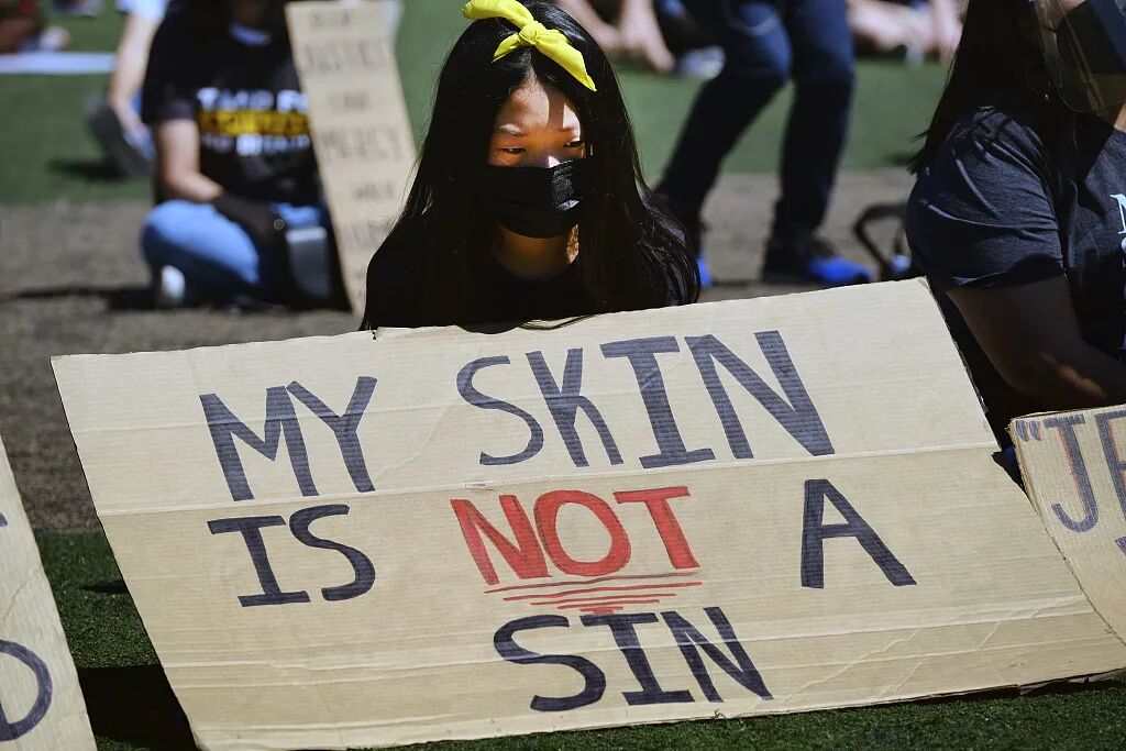 当地时间2021年3月28日,美国洛杉矶,当地举行示威抗议活动,女孩举着“我的肤色不是罪”的示威标语。图源:视觉中国