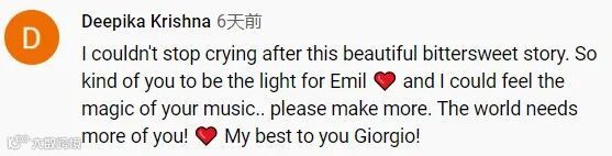 听完这个让人又感动又心碎的故事,我哭到停不下来。善良的你成了Emil的光。同时,我也感受到了你们合奏的魔力。请多弹吧。这个世间需要更多像你一样的人。把我最美好的祝福送给你!