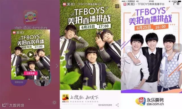 本次直播还配合站外宣传矩阵,饿了么当天的微信红包、搜狐新闻、永乐票务、乐视、掌阅iReader、荔枝FM等app的开屏,涵盖近二十个渠道。可见TFBOYS的当红程度,以及美拍对于各方资源的充分调配能力。