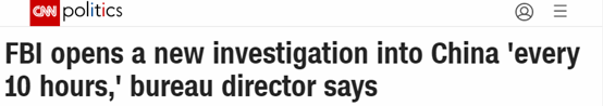 据外媒报道,当地时间4月14日,美国联邦调查局(FBI)局长在参议院情报委员会听证会上说,“FBI每10小时就开启一项针对中国的新调查(FBI opens a new investigation into China 'every 10 hours')。”