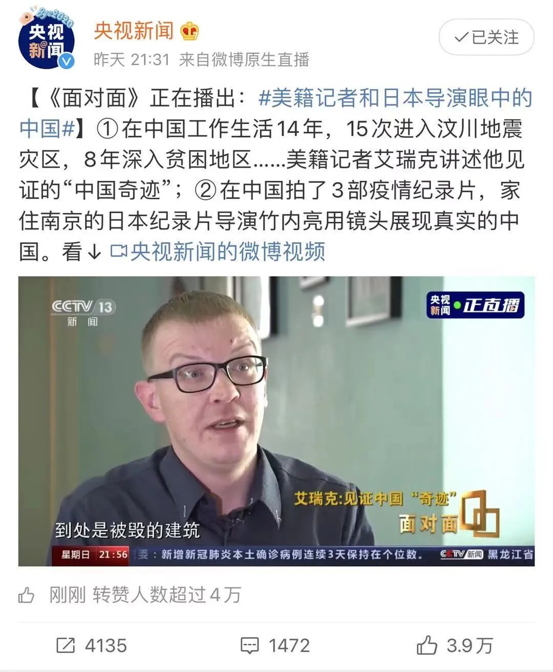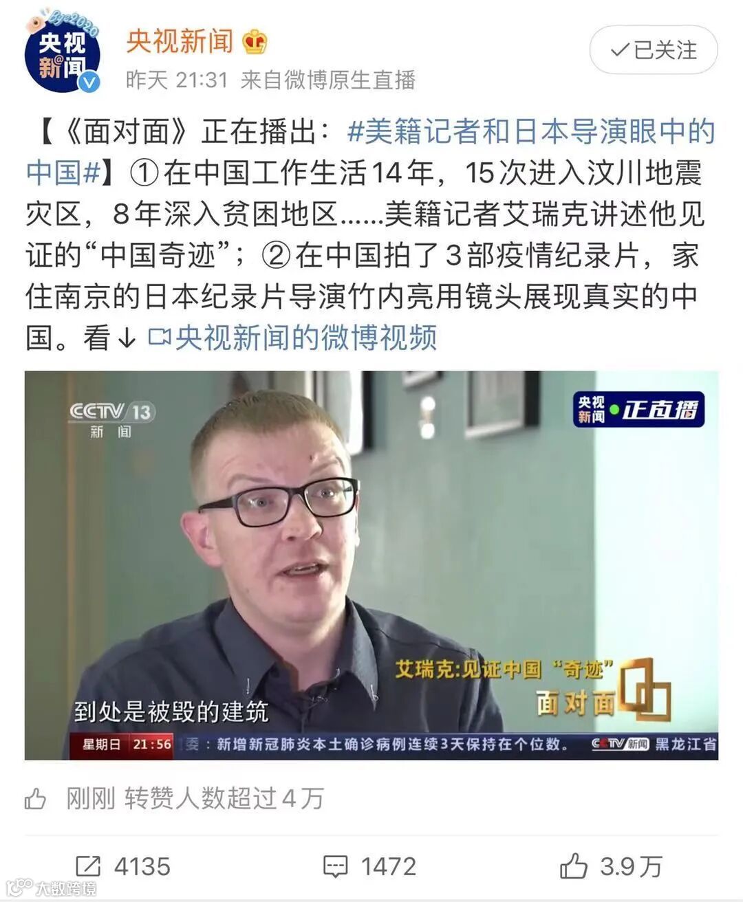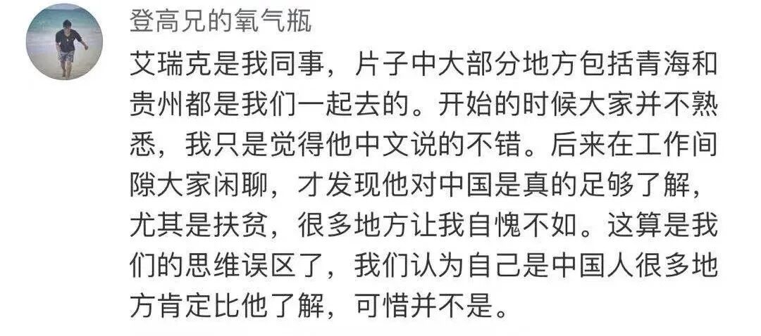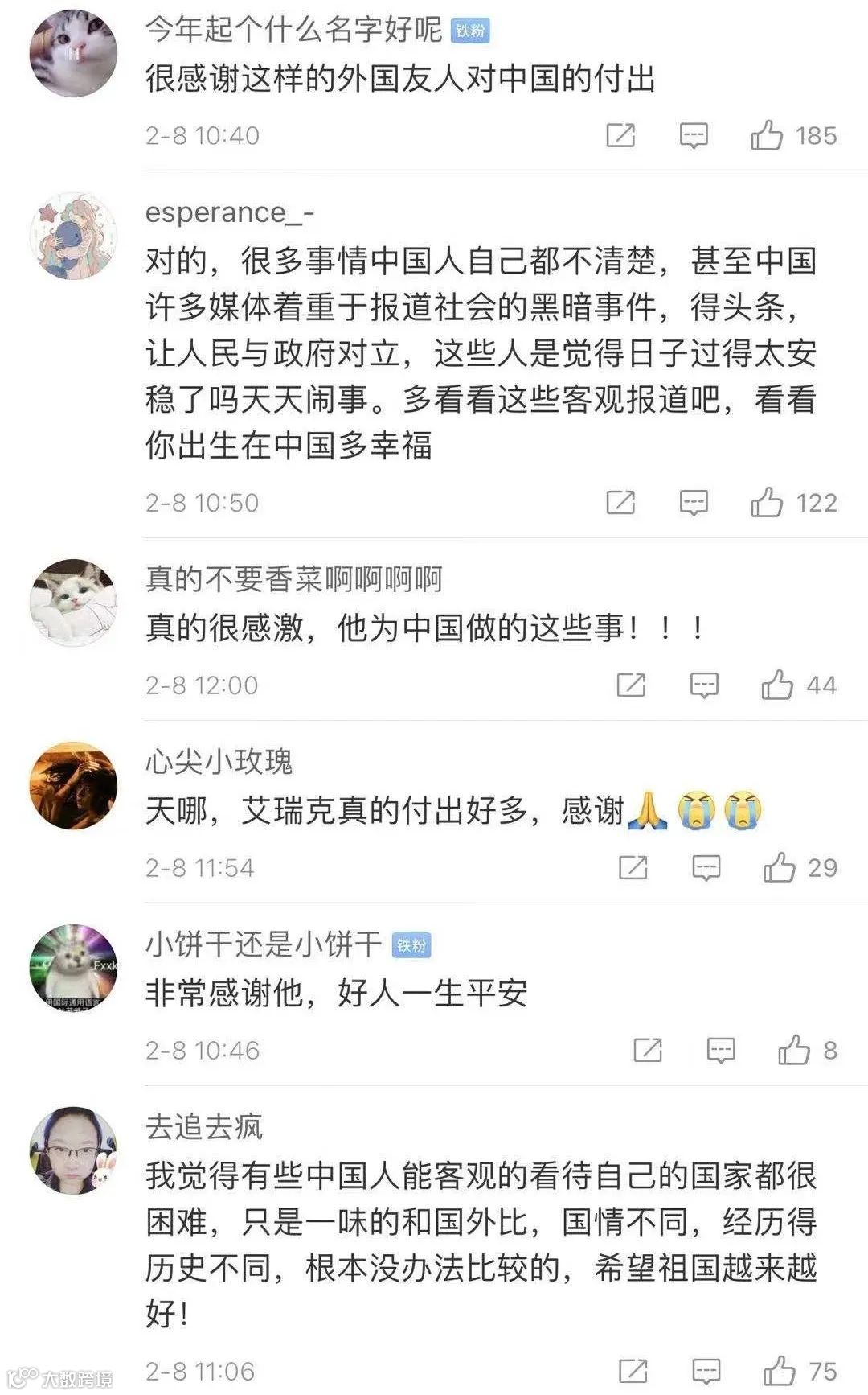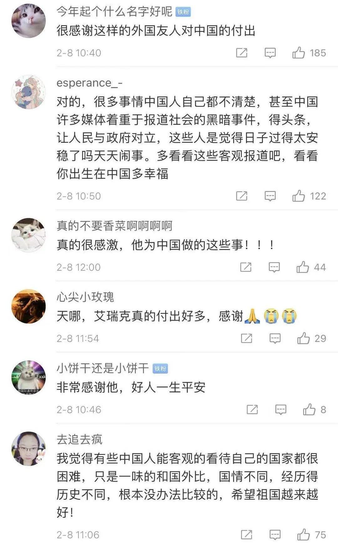 在微博上,很多网友在评论区对艾瑞克的付出表示感谢,谢谢他让世界看到一个真实的中国。
