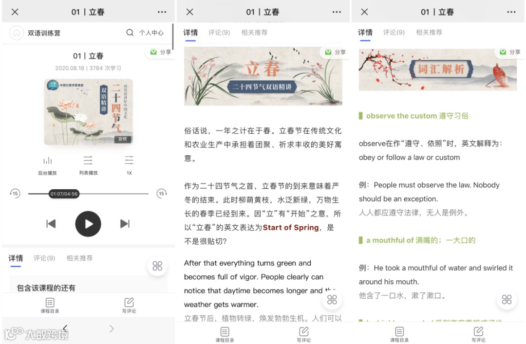《二十四节气双语精讲》课程里干货满满,帮你克服传统文化词汇“中翻英”的难题,告别DIY单词和神翻译。