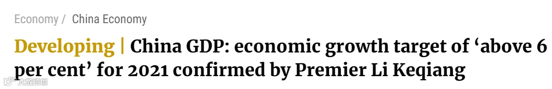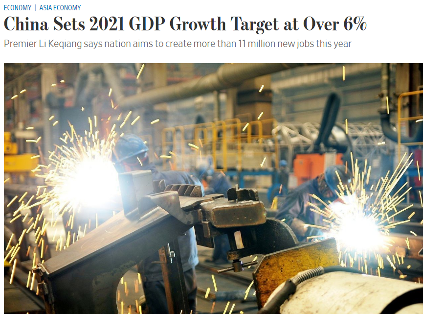 华尔街日报:中国将2021年GDP增长目标定为6%以上;国务院总理李克强表示中国将新增超过1100万城镇就业。