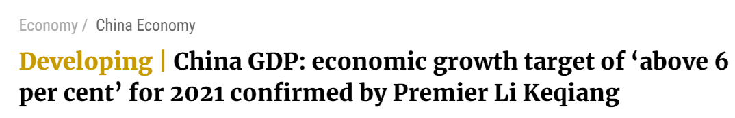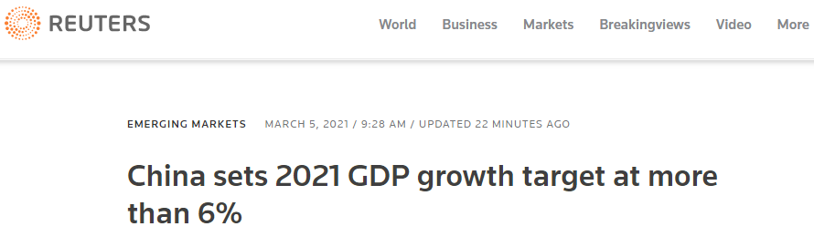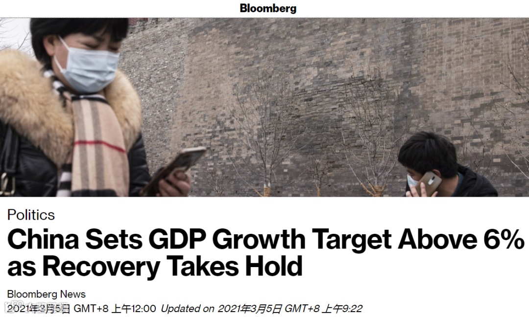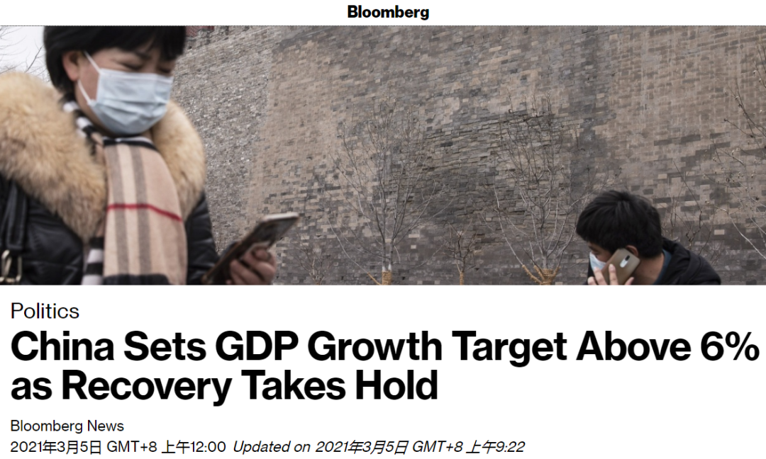 伴随经济复苏势头,中国将2021年GDP增长目标定为6%以上