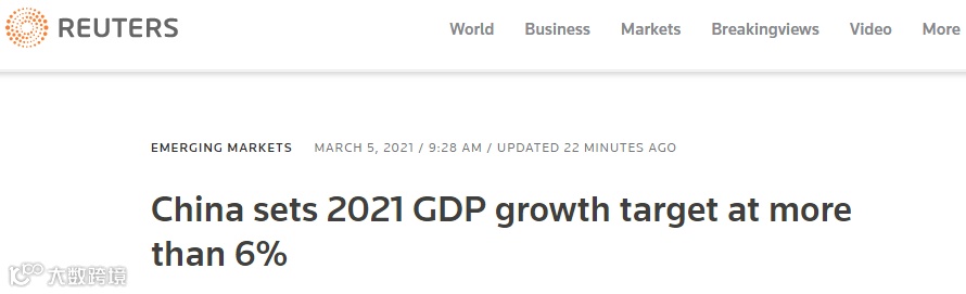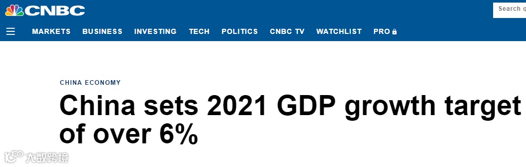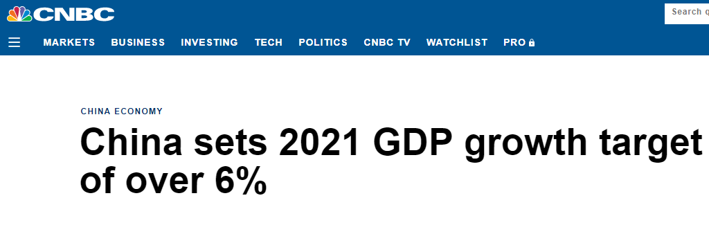 CNBC:中国将2021年GDP增长目标定为6%以上