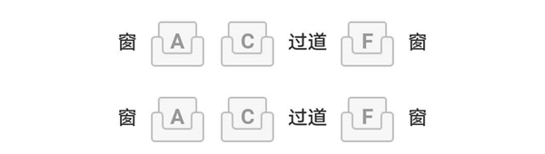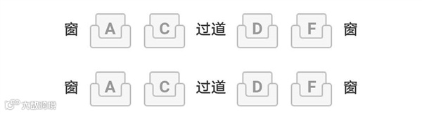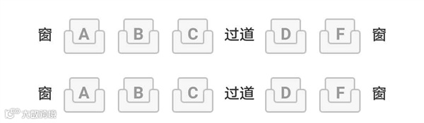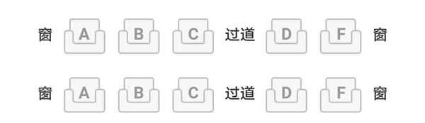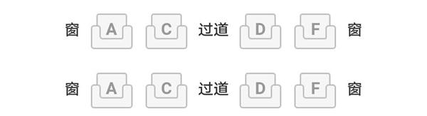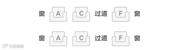我们看到,A和F代表靠窗的座位(window seats) ,C和D代表靠过道的位置(aisle seats),B和E是中间座位(middle seats)。