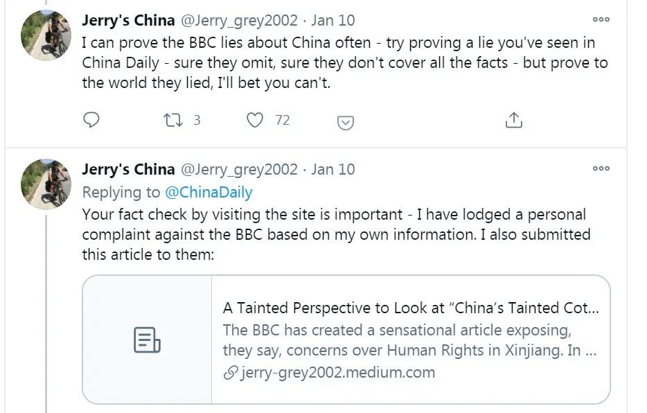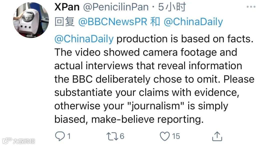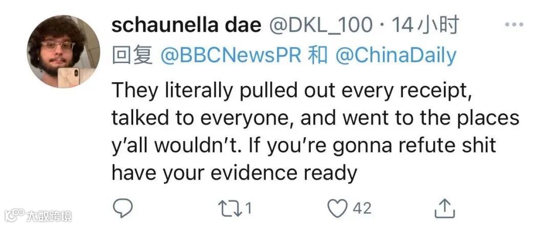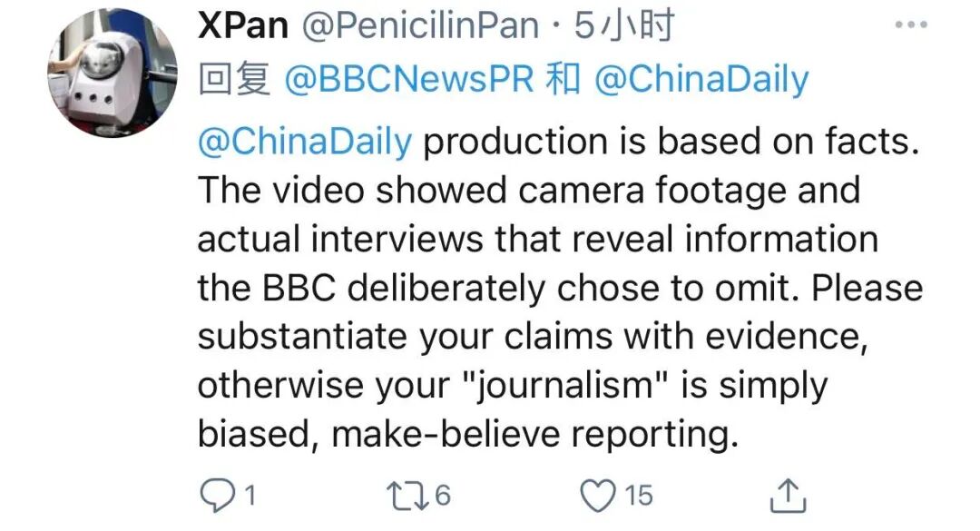 中国日报此次实地去新疆采访的记者、起底视频的主创人员之一也在推特账号上用英文回怼:“拿出证据,否则你们的所谓新闻只不过是片面的虚假报道。”
