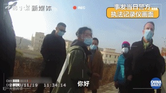 这只手的主人叫蒋勇,是工厂的安保负责人。当日的警方执法记录仪拍下了蒋勇和BBC一行人与警方沟通的画面。