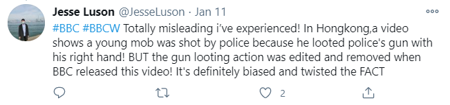 BBC这种彻底的误导我可是经历过。在香港,有一段视频显示,一个年轻的暴徒被警察枪击,那是因为他用右手抢劫了警察的枪!但是当BBC客户端发布这段视频时,却将抢劫的动作进行了编辑和删除!这完全是片面报道,而且扭曲了事实。