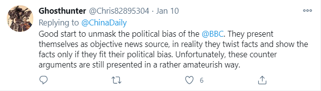 中国日报的报道是基于事实的。这条视频用镜头和真实的采访揭示了BBC刻意隐瞒的真相。请用证据来证明你们的观点,否则你们的所谓新闻只不过是片面的虚假报道。