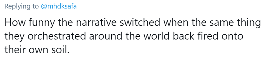 当美国在全世界精心策划的事发生在他们自己国家的时候,他们换了套说辞的姿态是多么可笑。