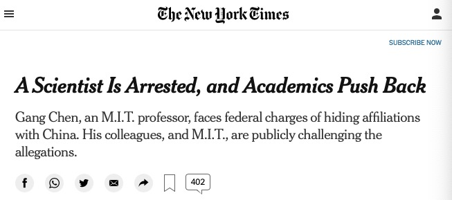 The university itself has challenged one of the prosecution’s assertions, saying that $19 million in Chinese funding cited in the criminal complaint was not granted to Dr. Chen individually, but rather was part of a well-publicized collaboration that Dr. Chen helped to broker between M.I.T. and a Chinese research center.