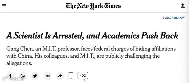 1月26日,《纽约时报》在报道中称,陈刚被捕后的10天里,他的同事们公开抗议,认为美国检方的行为已超出应有范畴,MIT校长及160多名教职员工签署公开信,声援陈刚。