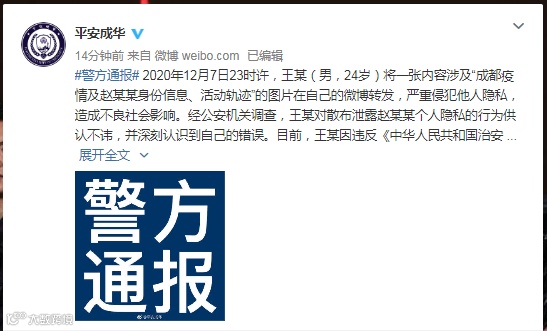 12月9日,四川省成都市公安局成华区分局通过其官方微博发布通报称,泄露成都确诊女孩信息男子已被行政处罚。