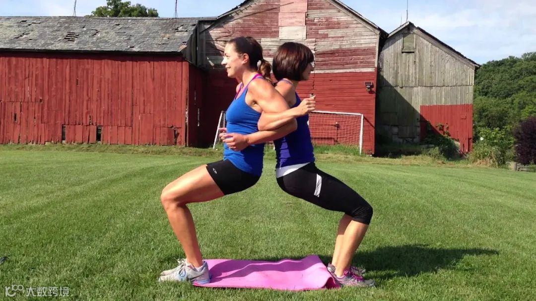 两个人背靠背坐着,手臂从背后挽住,需要一起站起来。