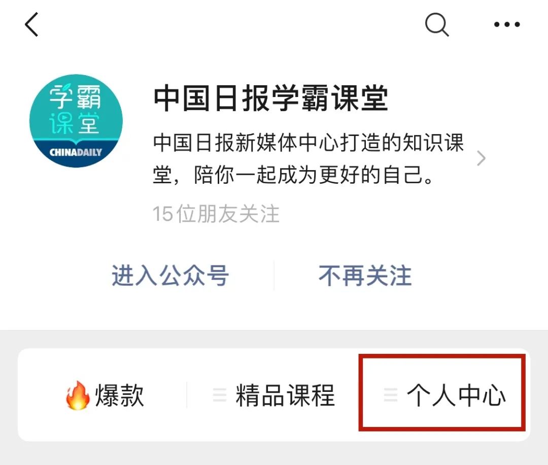 微信中搜索【中国日报学霸课堂】公众号,点击菜单栏“个人中心”——“我的课程”,即可开始课程学习啦。
