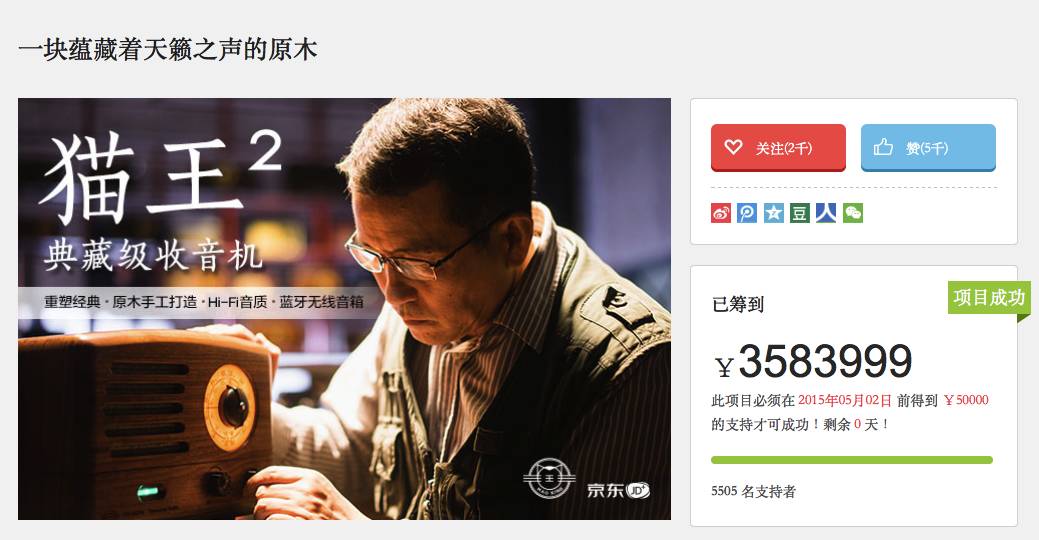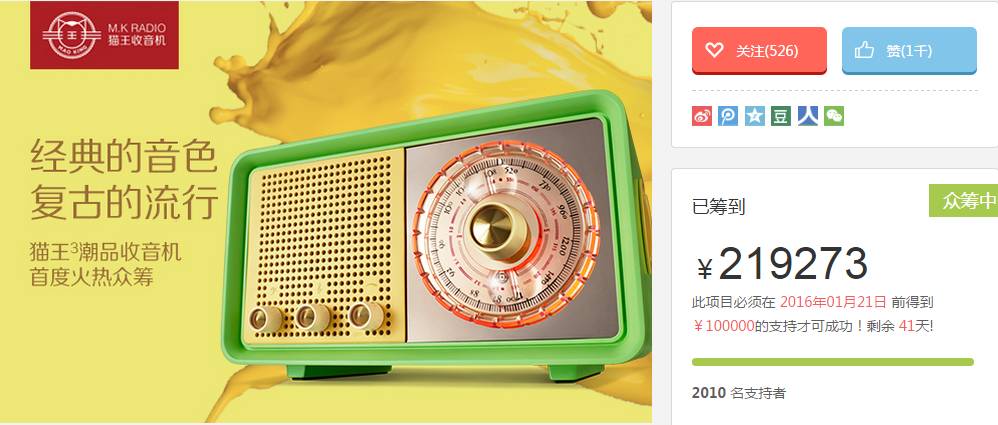 众筹成功!猫王成为了第一个在音响界以小众产品突破一百万的项目。通过这次众筹,猫王品牌在行业内算是树立起来了。