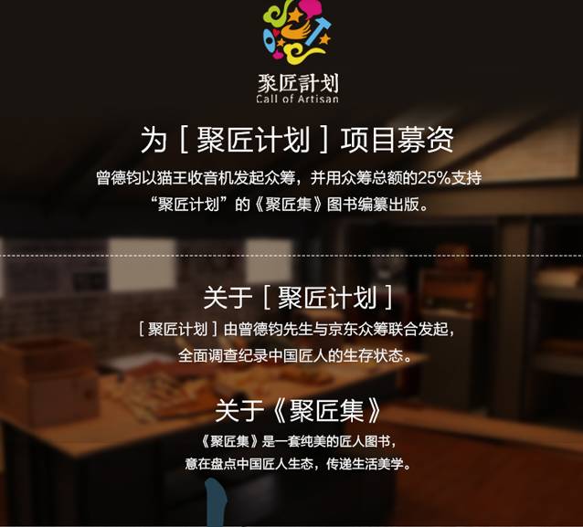 最近,曾老师又发起了第五次众筹,分别是有猫王bigger,猫王biggest,猫王³以及猫王¹特别版。其中最新款的猫王³的众筹筹款25%将会拿出来支持一个曾老自己发起的公益项目——聚匠计划(The Call of Artist),聚集散布在国内各地的优秀匠人,建立匠人信息的数据池,为匠人提供平台,帮助匠人的提高变现能力。