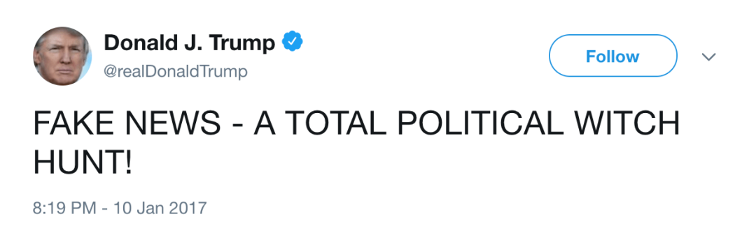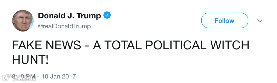 特朗普2017年1月10日推特:假新闻,完全是政治猎巫!