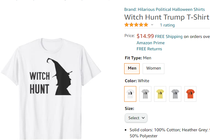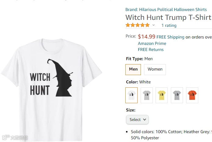 美国亚马逊网站售卖的特朗普“猎巫”T恤,14.99美元包邮。