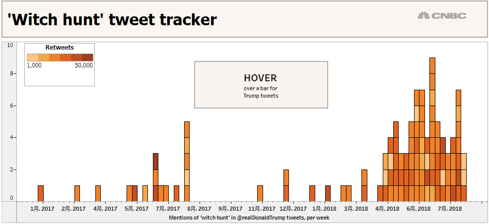 2018年8月,美媒CNBC统计特朗普推特中出现“witch hunt”的频次,在“通俄门”风波的不断发酵中日趋频繁。
