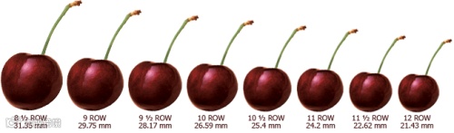 目前,美国和加拿大等北半球国家以“Row”(俗称“行号”)为标准对车厘子进行分级。行号越小,车厘子越大;车厘子的大小多在8号行和12号行之间变化。