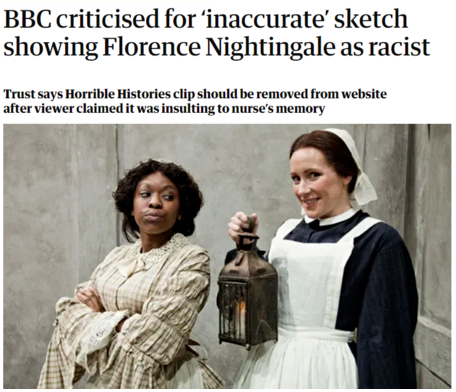 Earlier in 2014, the BBC was criticized for a sketch which depicted Florence Nightingale as racist, which viewers claimed was insulting to nurse's memory. The BBC apologized, admitted that the content was biased and withdrew the episode.